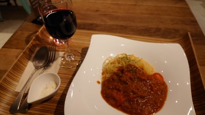 パスタは粉チーズをふりかけて、赤ワインといっしょにおいしくいただきました。